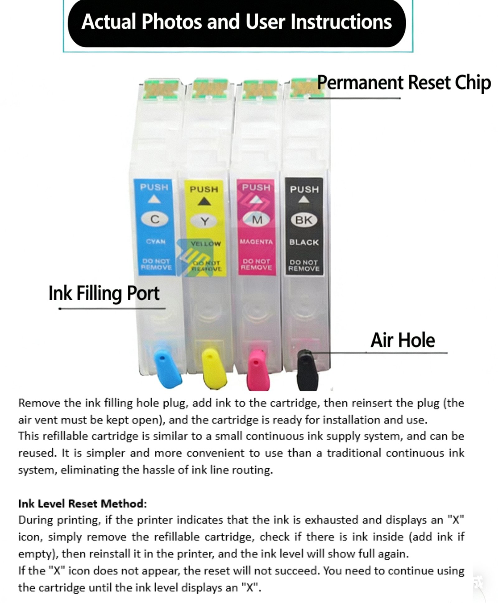 - Brand-new dual-hole circulation vacuum-free refillable ink cartridge, made of food-grade PP material with one-time injection molding。Adopts constant pressure design internally, no ink leakage or dripping. Compatible with dye ink, pigment ink, edible ink and other types of ink for refilling. Equipped with auto-reset permanent chip, ensuring the ink cartridge can be reused for multiple cycles.